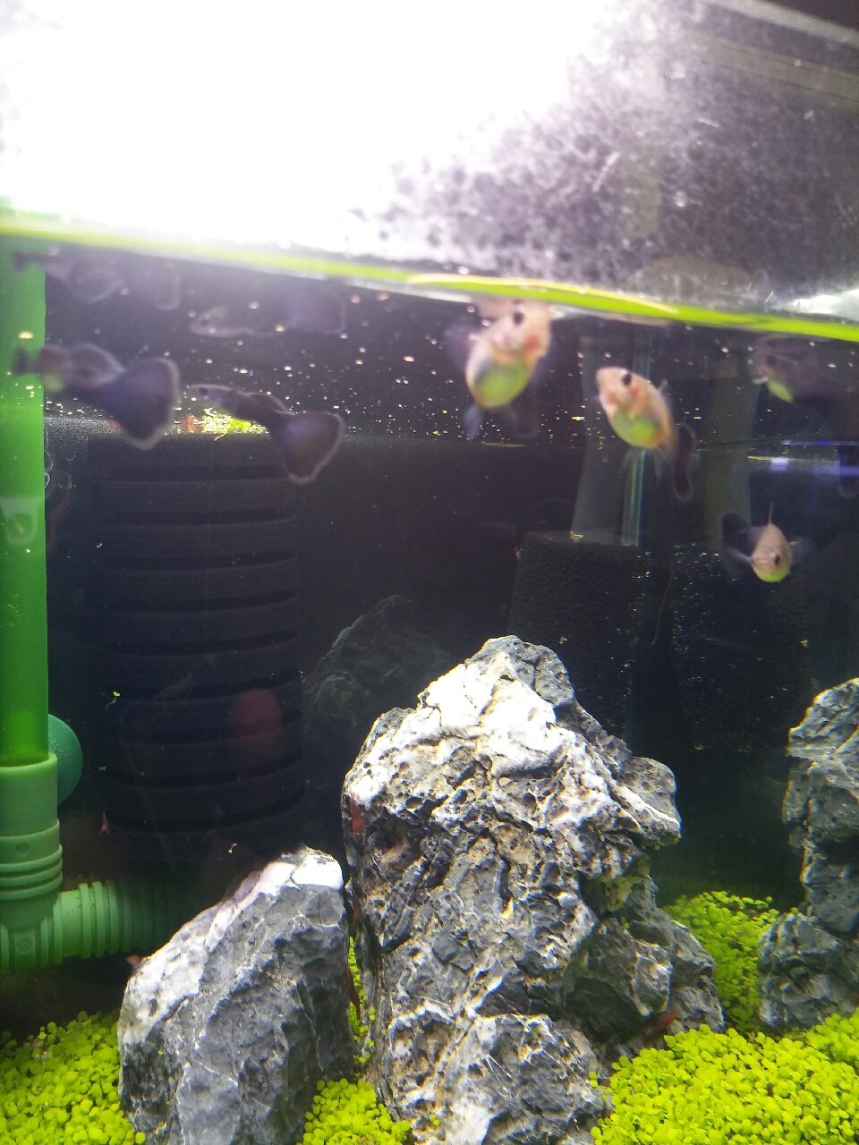 콩돌과 측면여과기는 여과기가 아니라는 점도 알아야 합니다. 어항 내에 에어레이션은 도움이 되지만 이 것 만으로는 충분하지 않습니다. 즉 여과기를 대체하지 않죠. 구피 키울때 여과기로는 스펀지 여과기가 가장 좋습니다. 수족관에 두꺼운 필터나 여과기 등을 사용하면 무산소 영역이 생겨 유익한 박테리아가 질산염을 질소와 산소 가스로 변환하여 물을 정화시켜 줍니다. 이 가스는 기포 형태로 여과기에 축적되어 공기 중에 방출됩니다. 여과기에서 작거나 큰 기포가 떠 다니는 경우 박테리아가 물 정화 작업을 수행하고 있다고 생각하시면 됩니다.